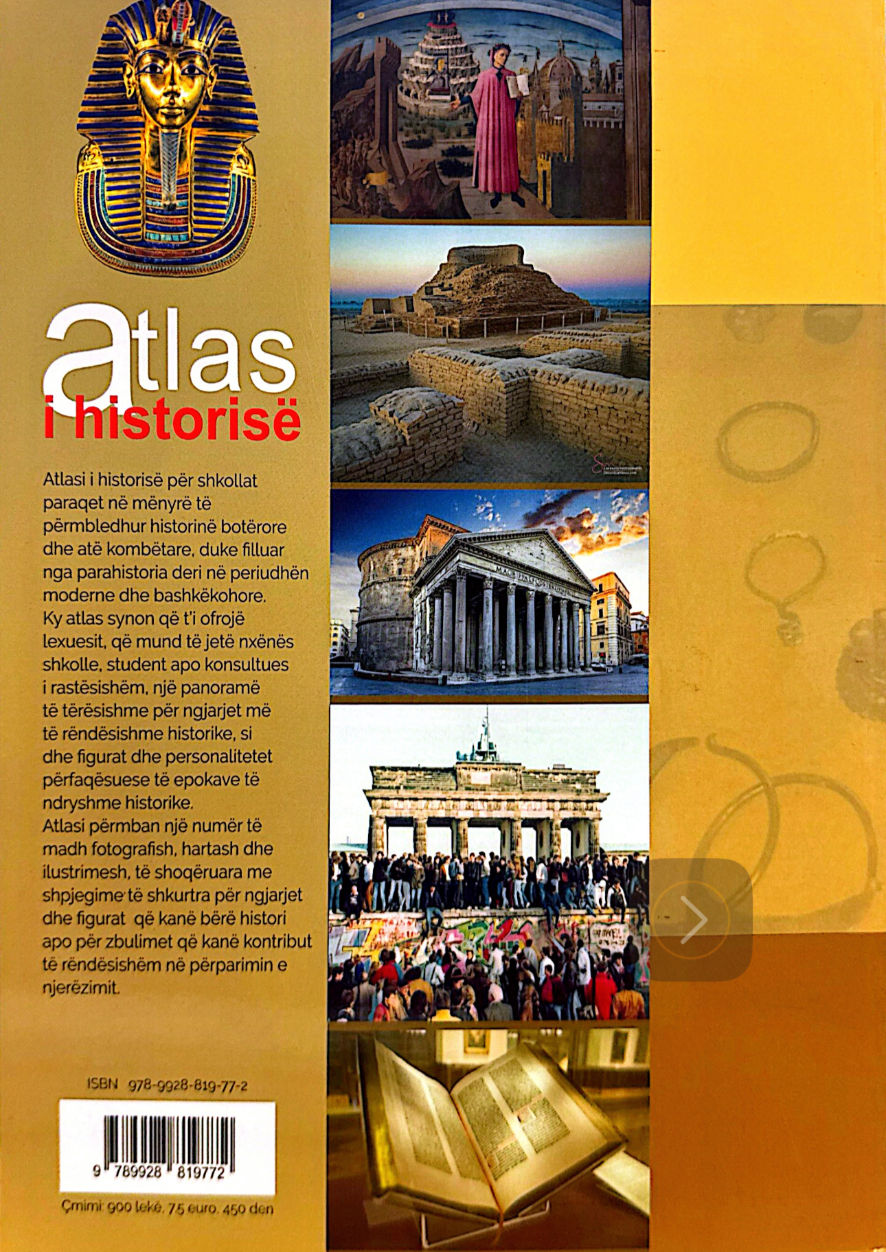 Ky atlas ofron një paraqitje të përmbledhur dhe të strukturuar të historisë, duke kombinuar harta historike, ilustrime, skema kronologjike dhe shpjegime të qarta. Përmbajtja është e organizuar sipas periudhave kryesore historike, nga lashtësia deri në kohët moderne, duke ndihmuar në kuptimin e zhvillimeve politike, shoqërore dhe kulturore.