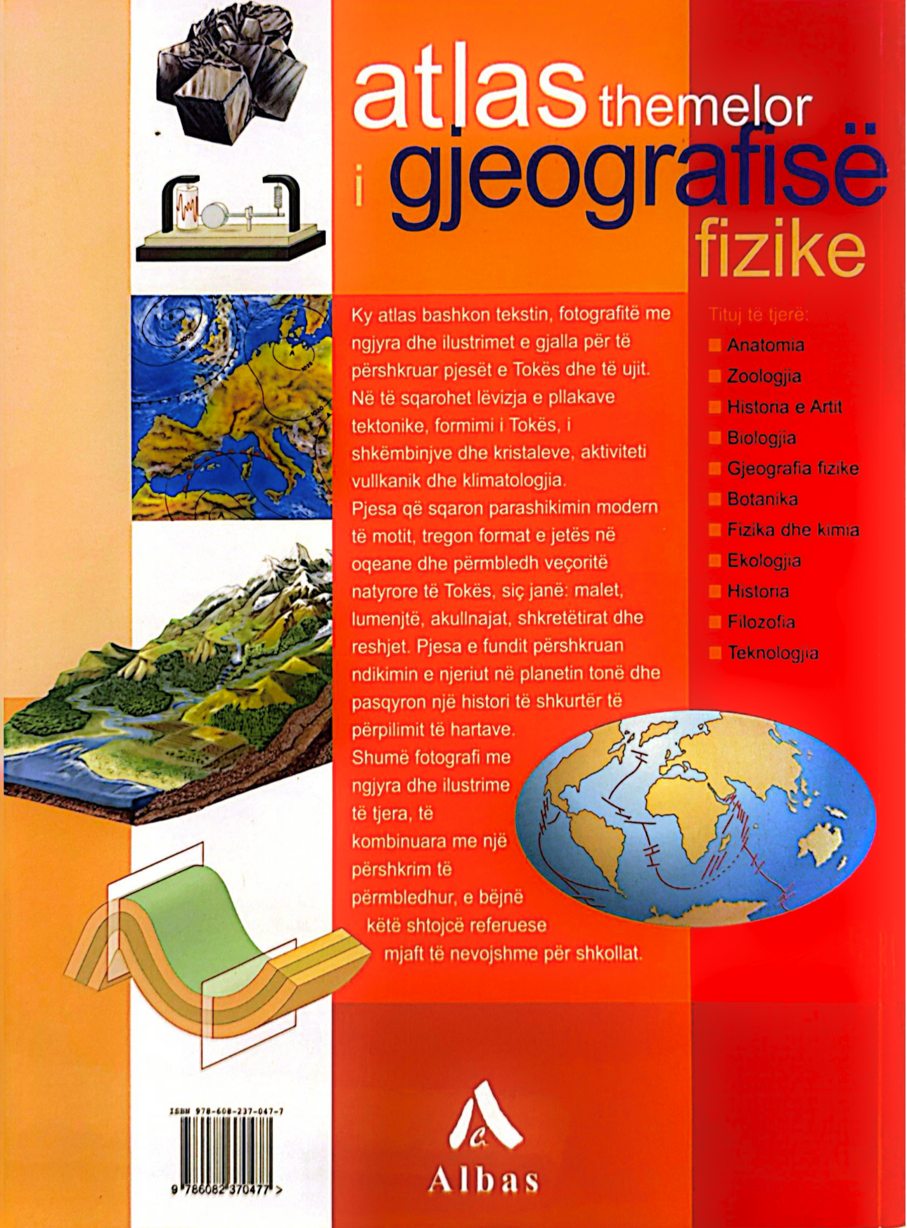 Ky atlas ofron një paraqitje të qartë dhe të strukturuar të elementeve kryesore të gjeografisë fizike, duke u mbështetur në harta tematike, skema, ilustrime dhe përshkrime shpjeguese. Përmbajtja trajton relievin, klimën, ujërat, tokat, bimësinë dhe proceset natyrore që formësojnë sipërfaqen e Tokës.