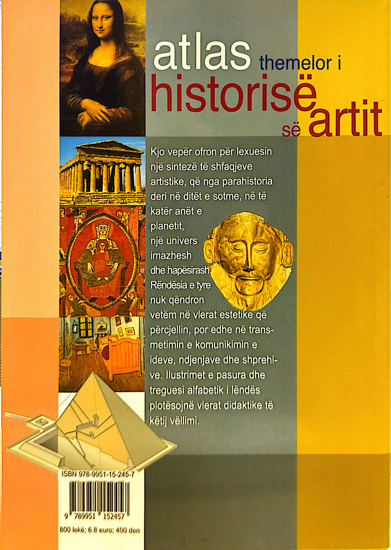 Ky atlas paraqet në mënyrë të përmbledhur dhe të strukturuar zhvillimin e historisë së artit, nga periudhat e hershme deri në artin modern. Përmbajtja mbështetet në ilustrime përfaqësuese, skema kronologjike dhe shpjegime të qarta, që ndihmojnë në kuptimin e stileve artistike, rrymave kryesore dhe veprave më karakteristike.