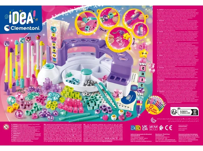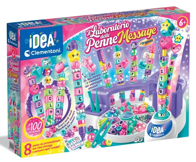 Clementoni Idea Laboratorio delle Penne Message është një set kreativ dhe argëtues që u jep fëmijëve mundësinë të krijojnë stilolapsa unikë dhe personalë. Ky laborator kreativ i lejon ata të dekorojnë stilolapsat me ngjyra, forma dhe mesazhe origjinale, duke nxitur imagjinatën, kreativitetin dhe aftësitë manuale.